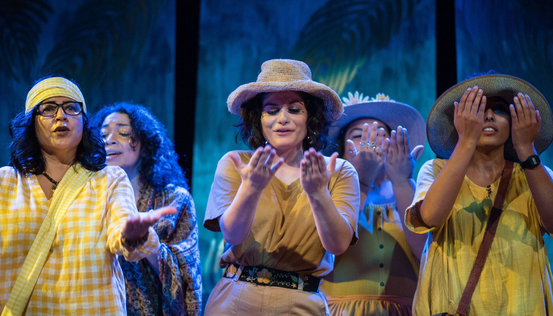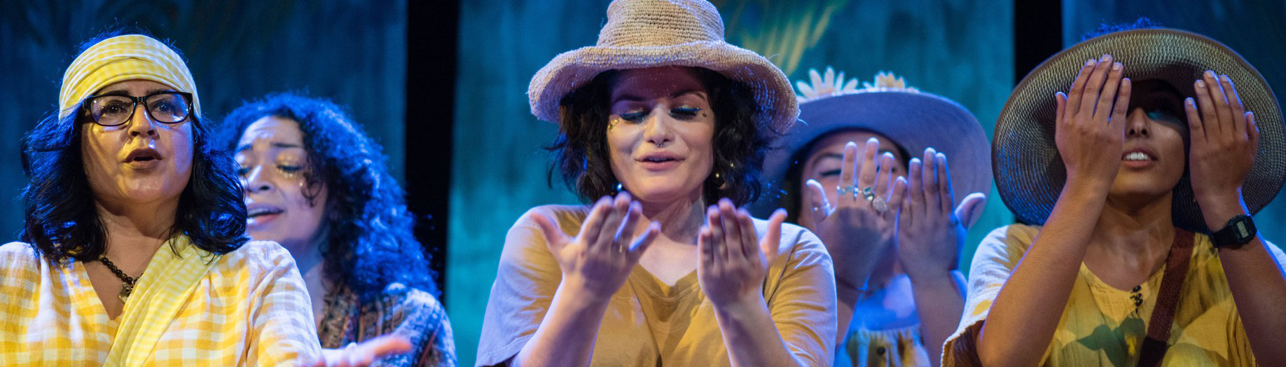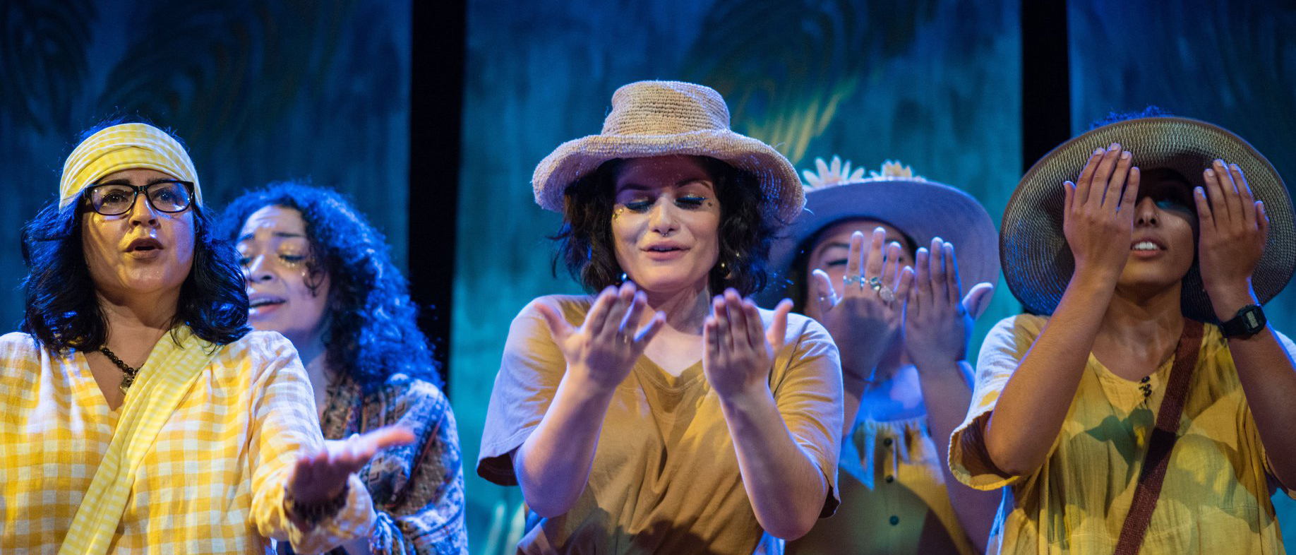 We see the heads and shoulders of two rows of people, wearing yellow shirts and straw hats. They hold two hands up in front of their faces, palms in, some have rings or watches. The background suggests they are outdoors, in a place filled with lush plants and greenery.